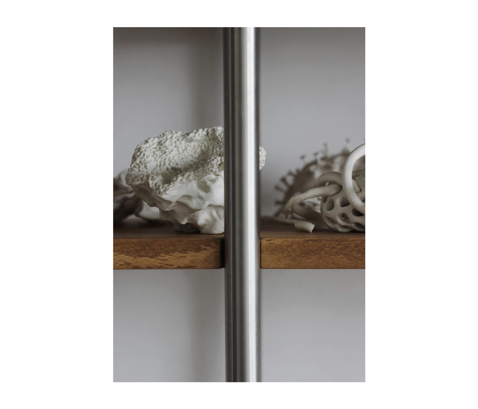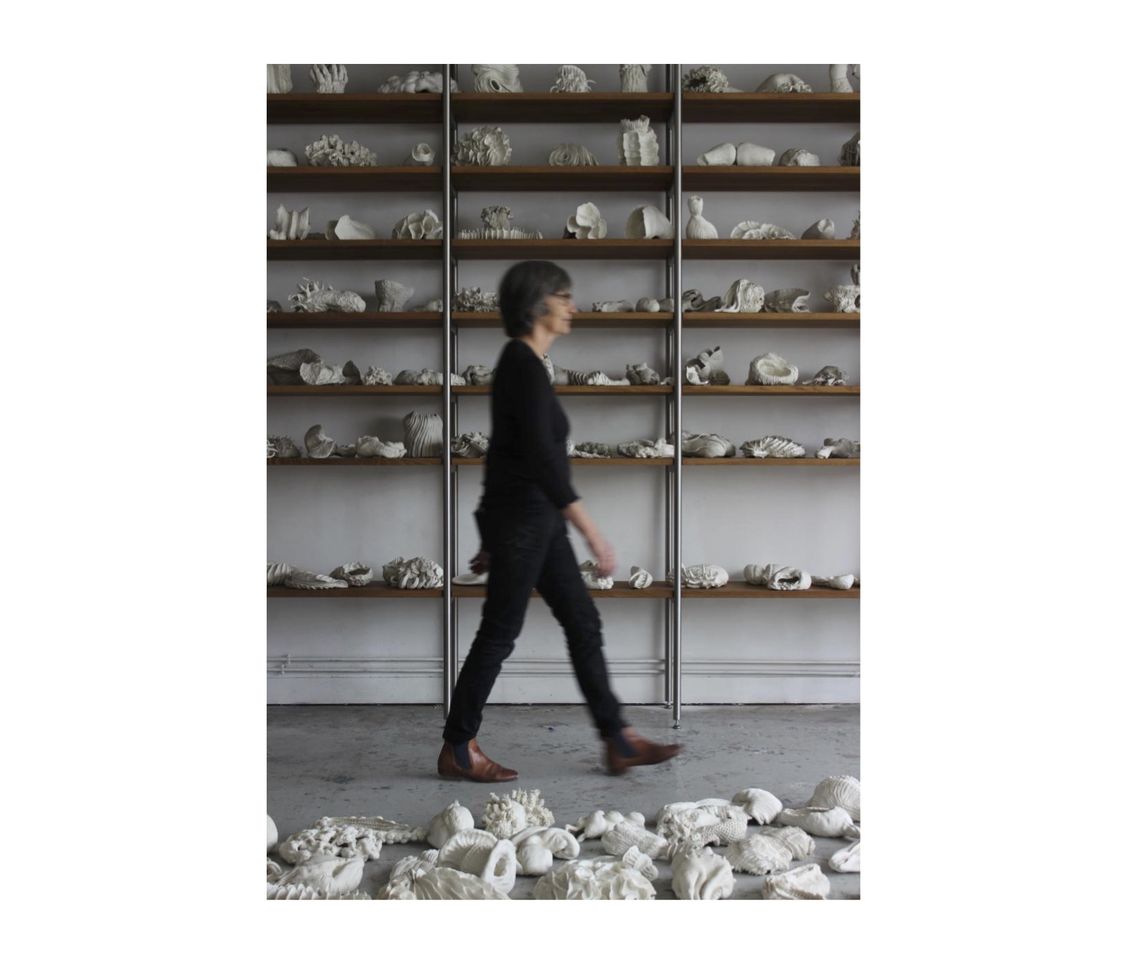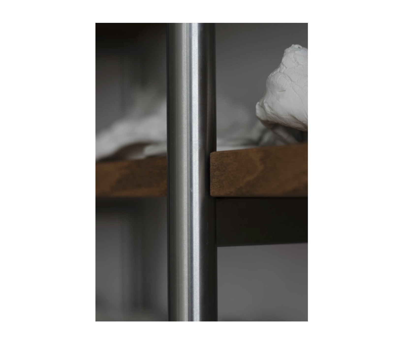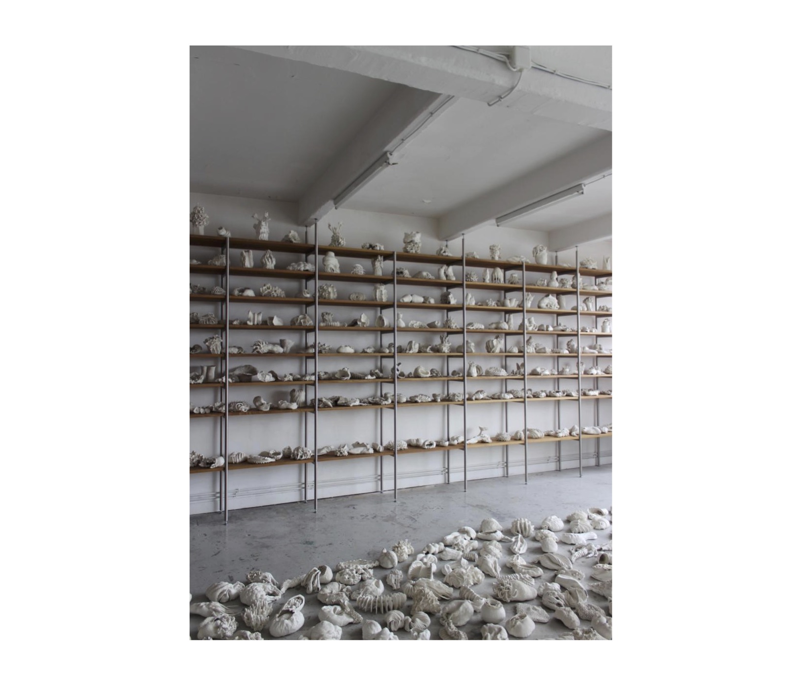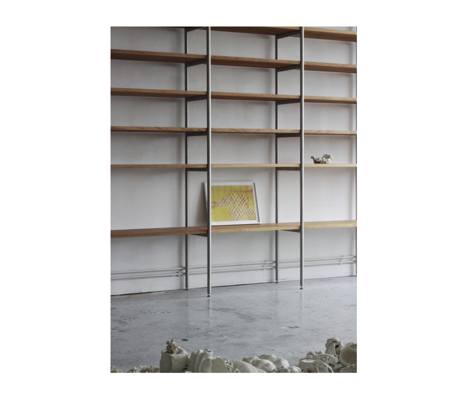 Implanté au sein d’un atelier d’artistes partagé, le dispositif conçu fait office à la fois d’espace de stockage, de présentation et d'installation artistique. La collection, appelée à s’enrichir et à être exposée dans des contextes variés, a conduit à une conception fondée sur des modules répétitifs, entièrement démontables et facilement transportables. La trame de la bibliothèque s’inspire du système structurel existant en poteaux poutres de béton. Ce principe est transposé à l’échelle du mobilier et se traduit par un assemblage d'échelles tubulaires en inox supportant des plateaux en hêtre massif.