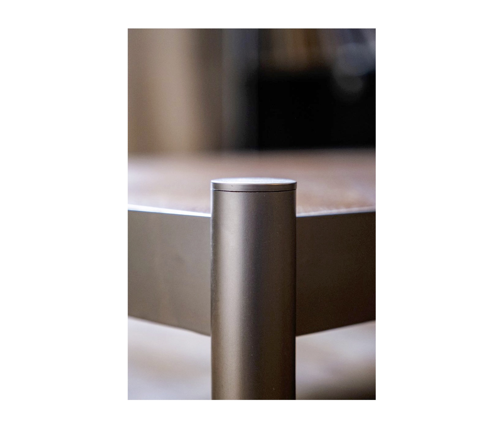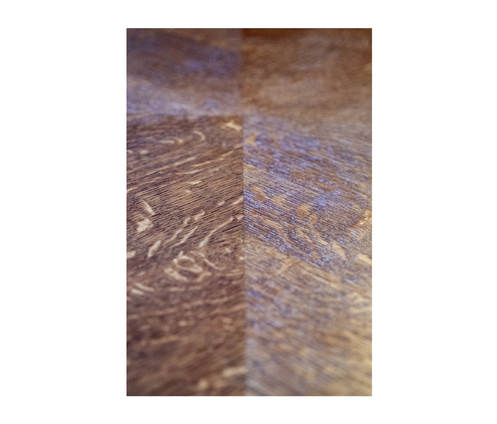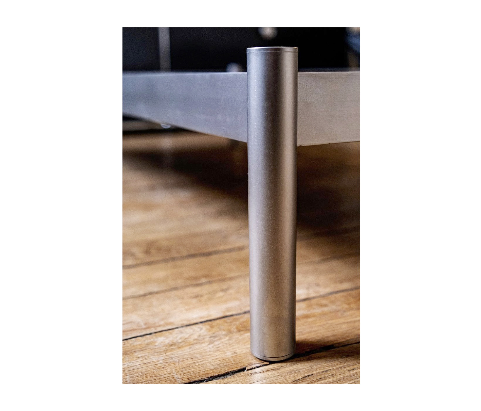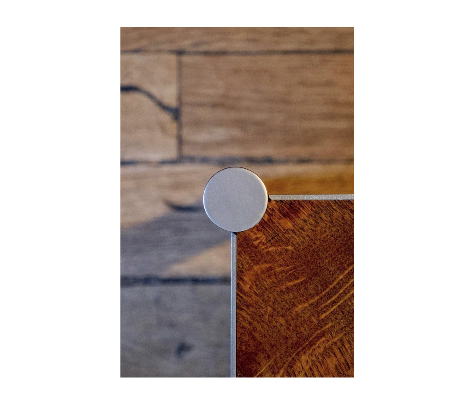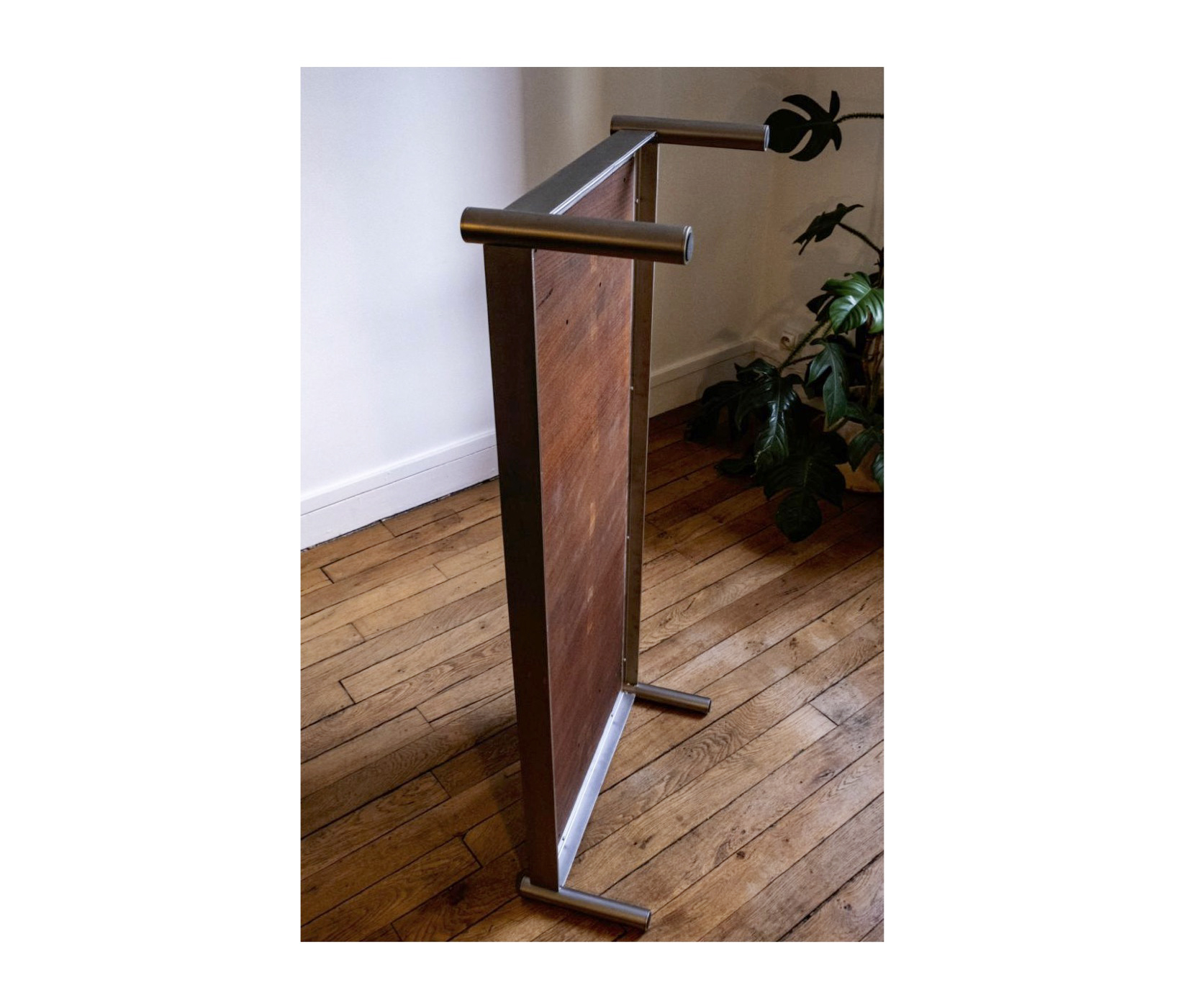 Cet objet propose la réinterprétation d’un mobilier disparu ayant une forte valeur personnelle. Sa structure est réalisée en inox microbillé, dont les montants verticaux dépassent légèrement pour souligner la finesse du dessin. Au centre, un plateau en bois issu d’une ancienne table à manger a été usiné et reverni afin de venir affleurer parfaitement le cadre métallique. L’ensemble mise sur un design épuré et des assemblages simples. Cette géométrie lisible met en valeur le contraste de matières entre la finition mate sans imperfection de l’acier et le veinage irrégulier du bois restauré.
